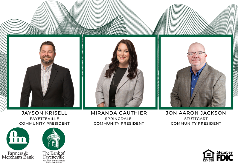 Farmers & Merchants Bank and The Bank of Fayetteville are proud to announce three leadership promotions that strengthen the bank’s presence in northwest Arkansas and Stuttgart.